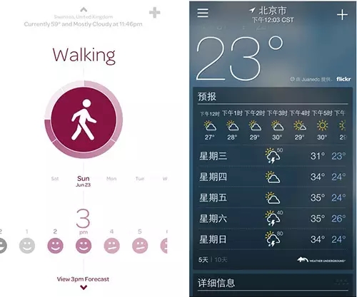 下面的兩個圖例雖然都以信息的展示為主,但因界面的信息量、app的功能特性因素的影響,左圖的運(yùn)動記錄界面信息量比較上,采用了中軸型布局,而右圖的天氣app信息量比較大,采用了滿版型布局。合理的布局選擇對于信息的展示有至關(guān)重要的作用。