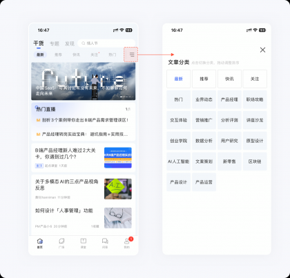 在頁(yè)面細(xì)節(jié)元素設(shè)計(jì)上,將角標(biāo)樣式優(yōu)化為右側(cè)的書簽的樣式,整體感受更像現(xiàn)實(shí)生活中的書簽。在輔助標(biāo)簽的設(shè)計(jì)上,將純文字樣式優(yōu)化為右側(cè)這種多彩面型的樣式,強(qiáng)化內(nèi)容的豐富和多元。