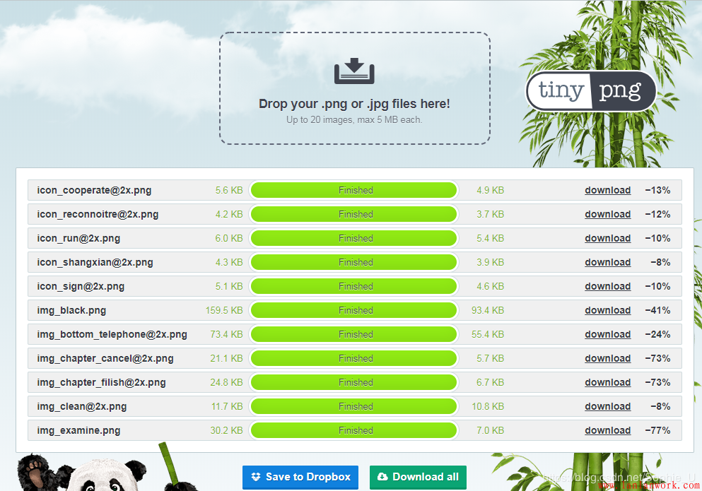 圖片小圖通過(guò)webpack可以直接轉(zhuǎn)為base64,而大圖可以通過(guò)壓縮或者換格式的方式來(lái)優(yōu)化,這里推薦一個(gè)好用的圖片壓縮工具,工具:tinyPNG,如下是圖片轉(zhuǎn)換前后對(duì)比