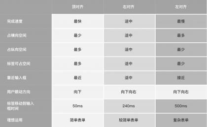 在設計表單時到底是左對齊、右對齊還是頂部對齊呢?這個問題也是在實際業(yè)務中設計師發(fā)問頻率較高的一個棘手問題。其實,不論是哪種方式都有相對的利弊,需要根據實際業(yè)務場景提供不同的解決方案。在Matteo Penzo《Label Placement in Forms》文章中有分享過關于表單標簽放置的研究,下圖是Matteo Penzo研究總結得到的瀏覽時間表: