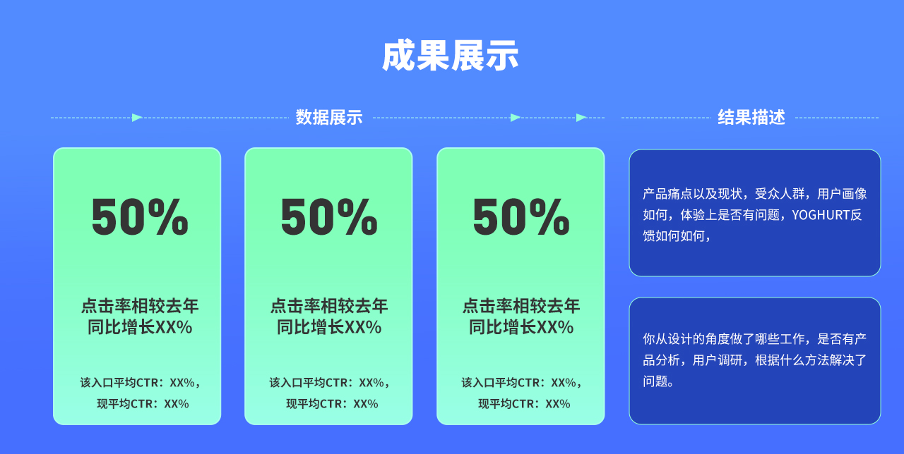 這一點其實說過很多次了,就是要把數(shù)據(jù)懟到評委的臉上,當(dāng)然了,我們的數(shù)據(jù),不僅僅是輸出多少張圖,做了幾個模板;我們數(shù)據(jù)可以從多個維度來判斷,比如設(shè)定活動模板化后設(shè)計效率提升xxx%,某個入口的用戶點擊率,轉(zhuǎn)化率分別提高了xxx%,當(dāng)然了,這個結(jié)果我前文提到過,要排除運營,產(chǎn)品等部門的因素影響,最后得到的才是你個人業(yè)績以及實際結(jié)果。