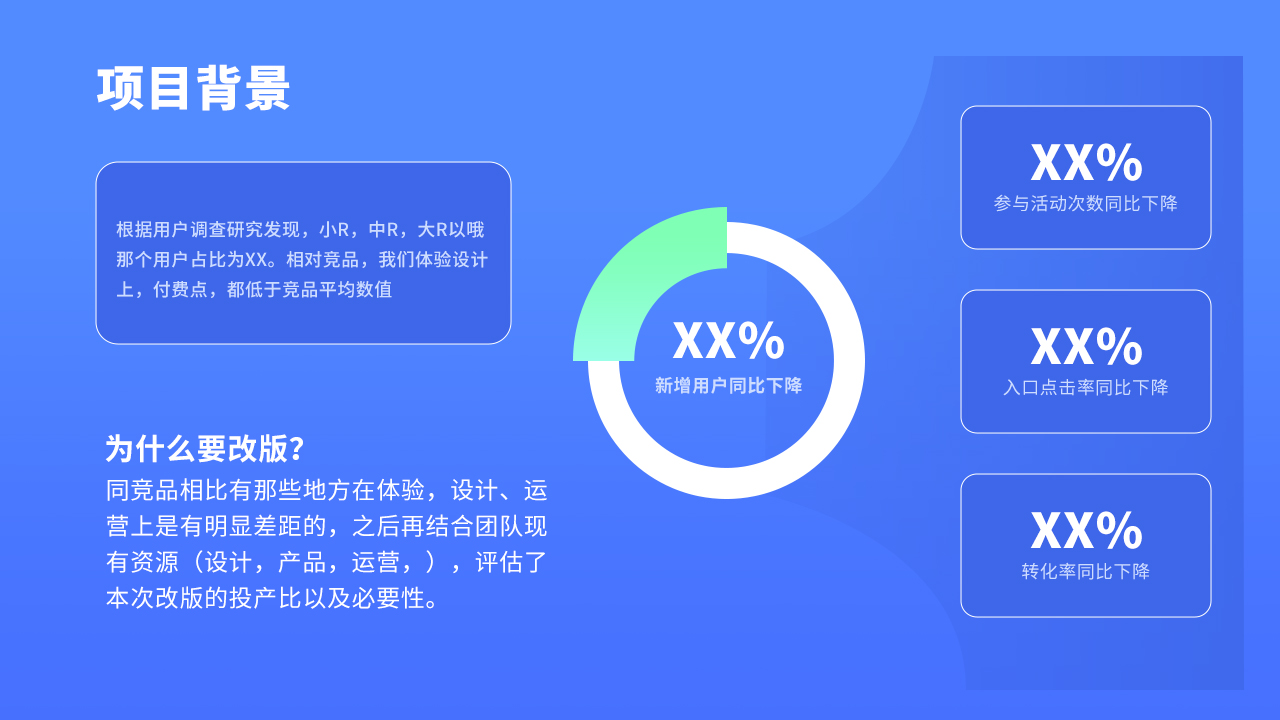 這一點很多同學(xué)會忽略掉,從一開始就已經(jīng)犯了一個致命的錯誤,那就是沒有項目背景,下面的評委不僅僅是你的leader,還有各個部門的負責(zé)人,也許針對你的項目,他們根本無從了解,唯一的渠道也去就是你的介紹和講解,因此這一部分是不能忽略掉的。