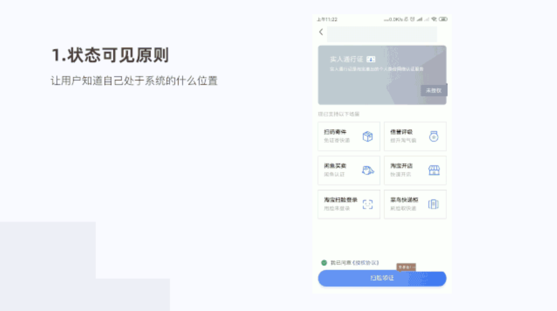在閑魚頁面我們系統(tǒng)的標(biāo)題欄、TAB欄的提示貫穿整體,用戶知道我們所處的什么頁面。比如認(rèn)證提示,每一步告知用戶進(jìn)行到哪里了。