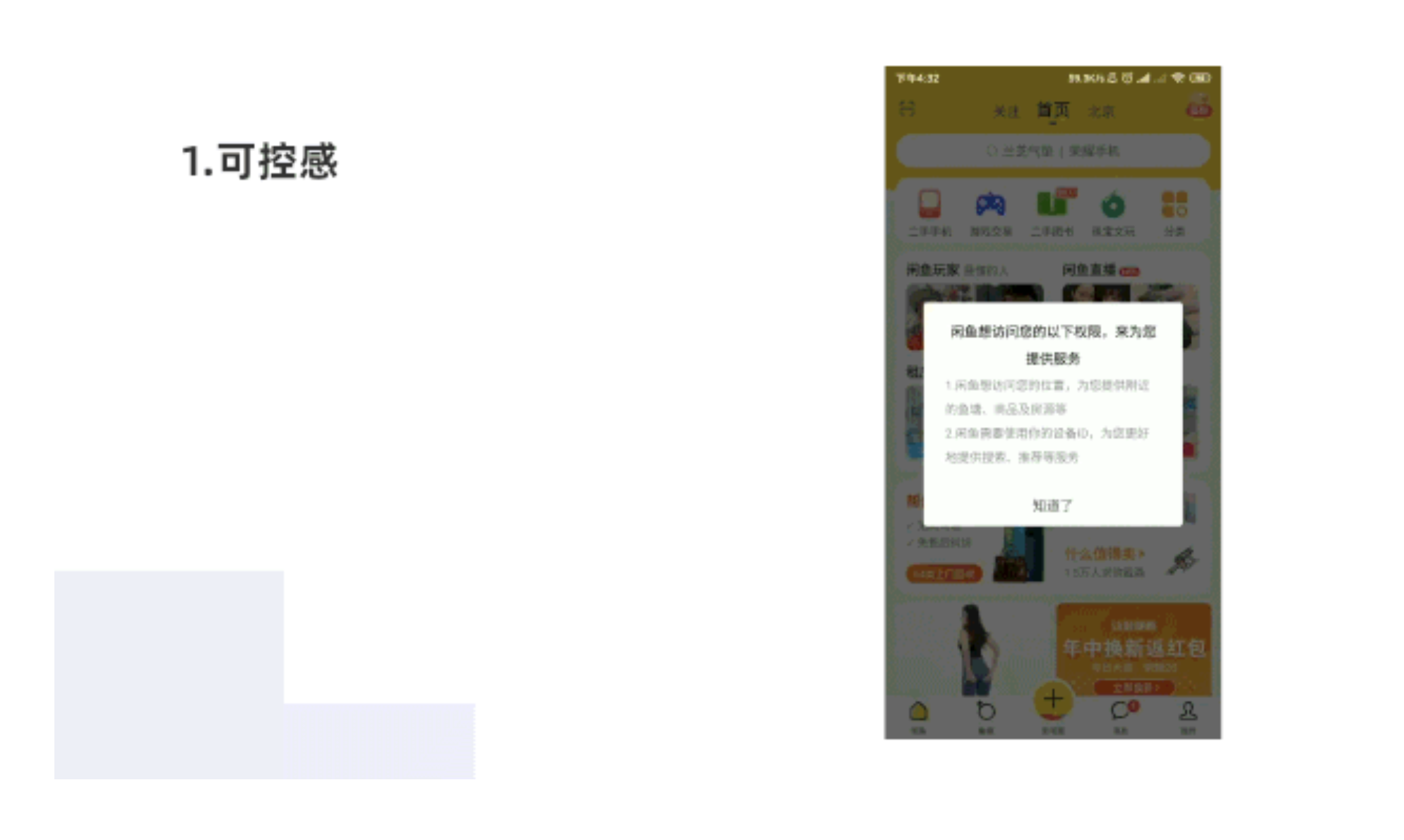 閑魚用戶登錄之后需要獲取權(quán)限,告知用戶選擇是否授權(quán)于產(chǎn)品這些權(quán)限,讓用戶操作可控。