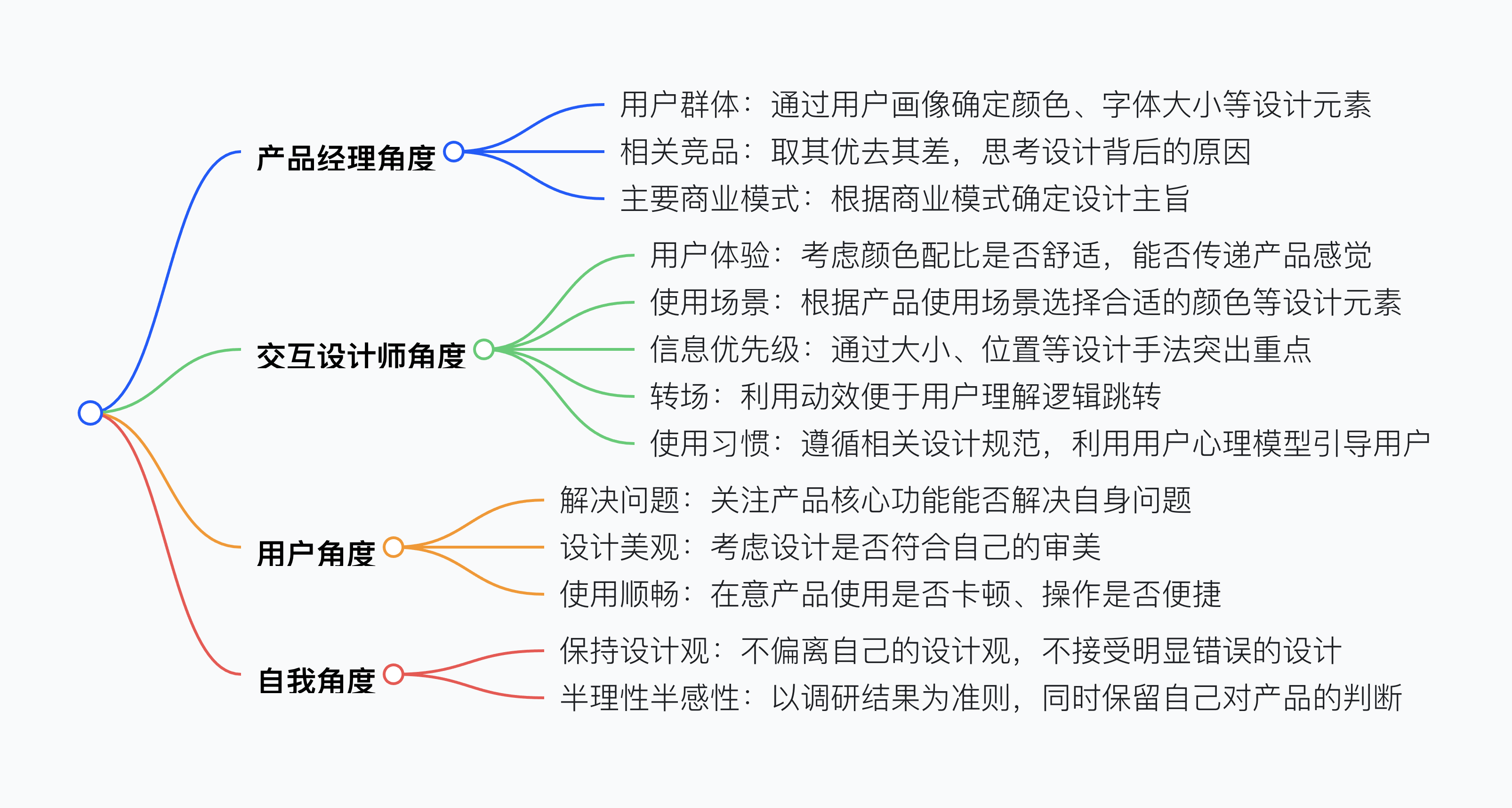 UI 設計需從產(chǎn)品經(jīng)理、交互設計師、用戶和自我這 4 個角度思考:像產(chǎn)品經(jīng)理一樣關注用戶群體、相關競品、主要商業(yè)模式;像交互設計師一樣考慮用戶體驗、使用場景、信息優(yōu)先級、轉場、使用習慣;像用戶一樣思考產(chǎn)品能否解決問題、設計是否美觀、使用是否順暢;像自己一樣保持設計觀,不盲目接受錯誤設計。如此才能做出符合用戶需求且有自己韻味的設計。