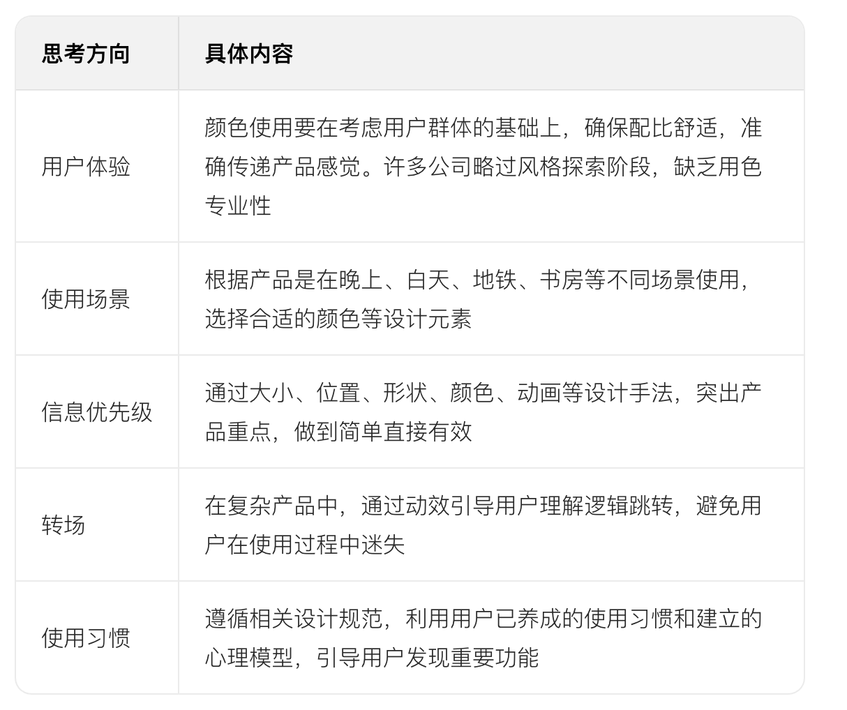 - 答案:交互設計師角度的思考包括用戶體驗、使用場景、信息優(yōu)先級、轉場、使用習慣等方面。在用戶體驗上,影響顏色配比的舒適性和對產(chǎn)品感覺的傳遞;在使用場景上,決定設計元素是否符合產(chǎn)品使用環(huán)境;在信息優(yōu)先級上,指導如何通過設計手法突出重點;在轉場上,幫助用戶理解邏輯跳轉;在使用習慣上,利用用戶心理模型引導操作,這些都能提升 UI 設計的實用性和用戶體驗。