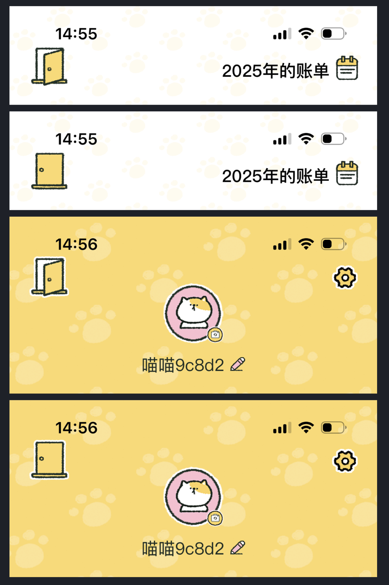常規(guī)返回功能總離不開 “箭頭” 或 “返回” 文字,用戶雖能理解,卻少了點(diǎn)情感共鳴。而喵喵記賬 APP的做法,是把 “層級切換” 轉(zhuǎn)化為用戶熟悉的生活場景 —— 用 “門” 作為核心元素。