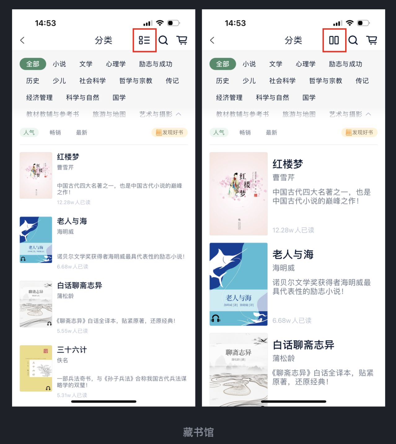 不是所有用戶都喜歡同一種瀏覽方式 —— 有人想快速掃過更多內(nèi)容,有人則希望看清封面和細(xì)節(jié)。藏書館 APP在 “書庫分類” 模塊里,就做了 “可切換大小” 的布局設(shè)計(jì):