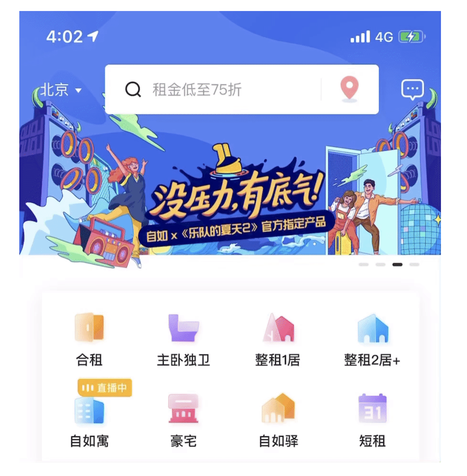 通欄 Banner 是首屏的 “???rdquo;—— 它占據(jù)整個(gè)頁面寬度,視覺沖擊力強(qiáng),適合傳遞單一、重要的信息,比如產(chǎn)品的年度活動(dòng)、核心功能更新。以自如的首頁 Banner 為例,通欄設(shè)計(jì)搭配 “租金低至 75 折” 的大標(biāo)題,配合分層視覺效果,瞬間抓住用戶對 “優(yōu)惠” 的注意力;再如工具類 APP 的 “版本更新” Banner,通欄布局讓 “立即升級” 的入口更突出,降低用戶操作成本。
