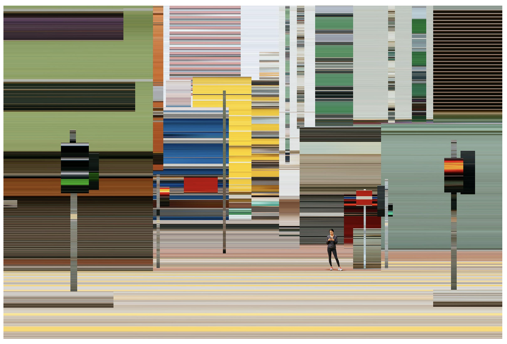 《時(shí)間拉伸》系列是一場(chǎng)關(guān)于感知邊界的探索,每一幅作品都構(gòu)建了一個(gè)超現(xiàn)實(shí)的視覺(jué)場(chǎng)域。藝術(shù)家以全球多個(gè)城市為拍攝背景,從繁華的都市街道到靜謐的自然角落,卻通過(guò) “拉伸時(shí)間” 的創(chuàng)作手法,將周圍的環(huán)境拆解、扭曲、重組。畫面中,中央人物始終保持著清晰、穩(wěn)定的姿態(tài),仿佛被按下了暫停鍵,脫離了時(shí)間的洪流;而背景中的建筑、街道、光影則被無(wú)限拉長(zhǎng)、模糊,化作流動(dòng)的色彩與線條,如同被時(shí)間的浪潮沖刷過(guò)的痕跡。