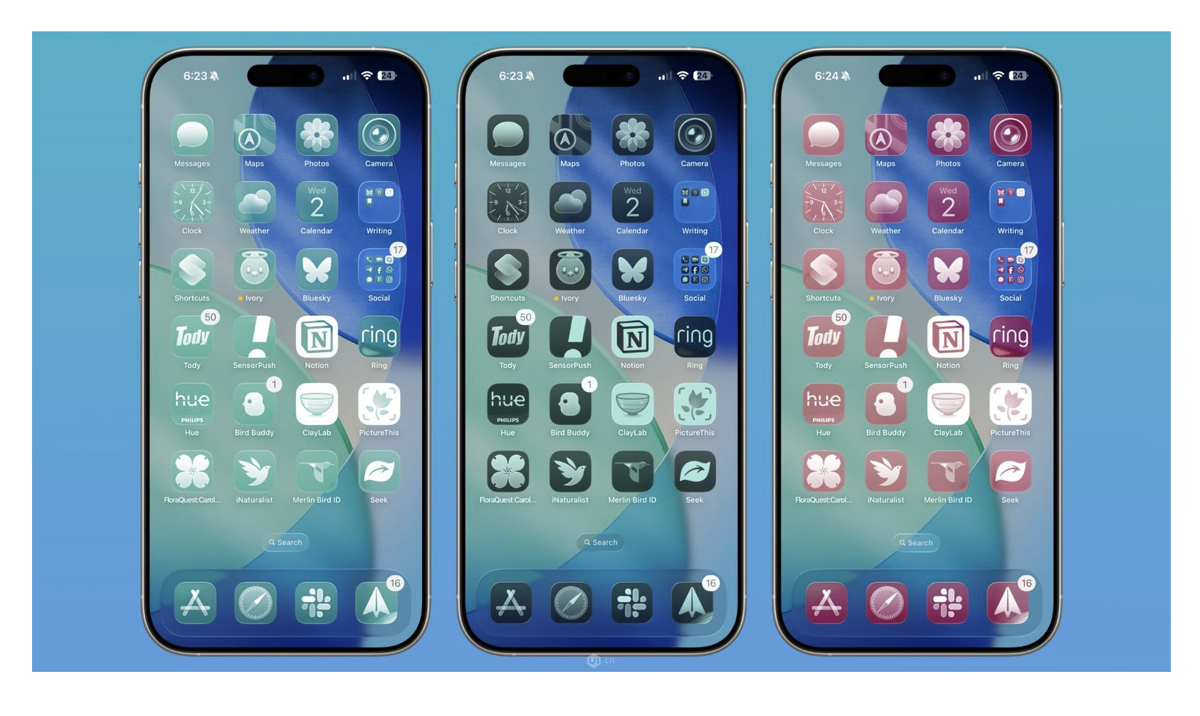 在色彩模式上,iOS 26 新增有色模式,與傳統(tǒng)的淺色、深色模式形成三足鼎立。淺色和深色模式下,液態(tài)玻璃效果保持一致,僅通過(guò)背景明暗度區(qū)分;而有色模式則以全彩基底搭配白色圖形,打造出鮮明活潑的視覺(jué)體驗(yàn)。