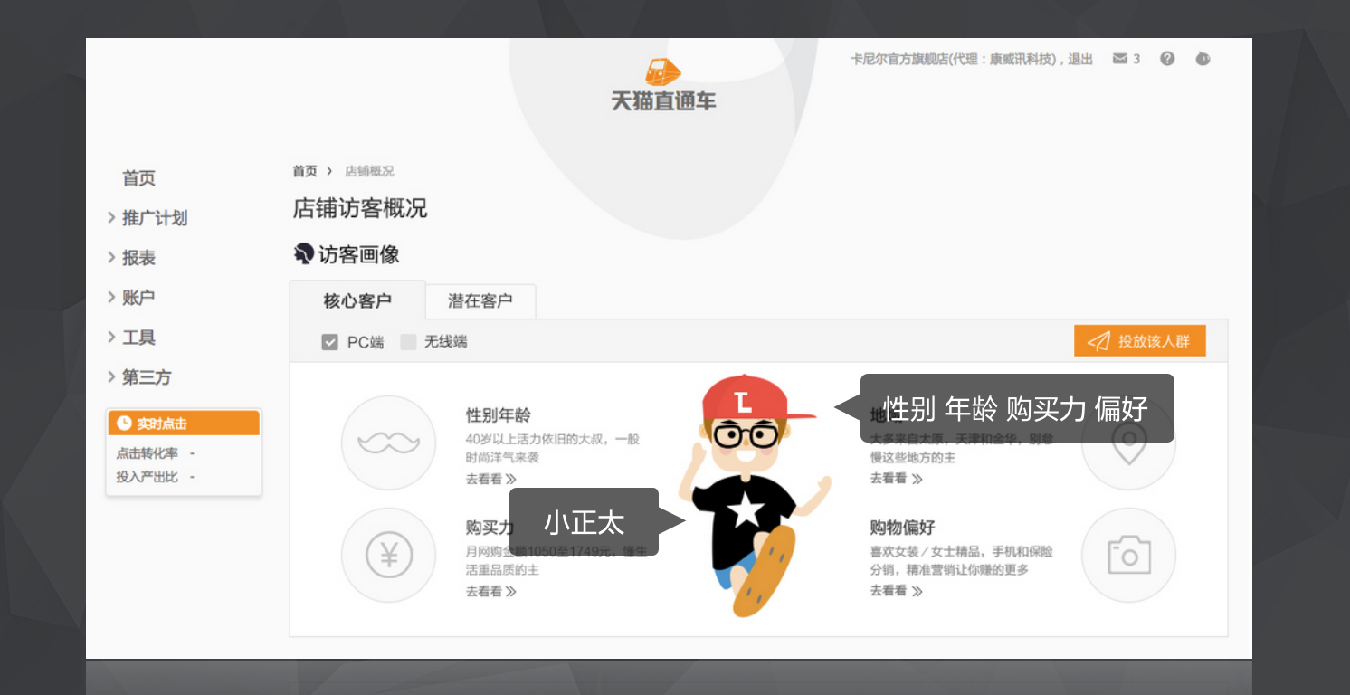 通過購買力,性別,年齡,偏好4個緯度來將訪客劃分為不同的類型,用手繪的形式來代替文案,讓用戶在短時間內(nèi)更容易的了解到到店訪客的情況。