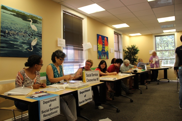 (找來(lái)Stanford別家NGO的義工還有我們VIA的領(lǐng)隊(duì)充當(dāng)“政府部門”,由于場(chǎng)地原因,這個(gè)Poverty Simulation不是在D.School里面做的,我們借用了校園里隔壁一棟樓的Seminar Room)
