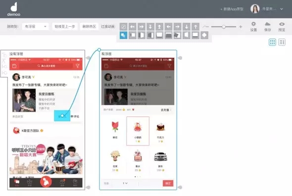 真實的app中,頁面間常常通過方向來示意層級關(guān)系,例如重新創(chuàng)建的流程,通常創(chuàng)建頁面會從底部向上呼起,于是,在建立熱區(qū)鏈接過程時,我們需要對鏈接進行方向設(shè)定。如圖示,我將點歌臺呼起的頁面出現(xiàn)形式,設(shè)定為從下往上出。如果不是很確定切換效果,Demoo很細心的在這里設(shè)計了動畫預(yù)覽,鼠標停留在小方塊上時,會有微動畫示意,多看幾遍也就明白了。
