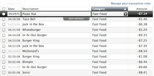 如果表格信息很多,分成幾列,可以對列進(jìn)行排序,用戶可以選擇按他們希望的方式瀏覽。 Mint.com 對交易列表進(jìn)行了排序,用戶可以很容易地從按日期瀏覽切換到按種類瀏覽,從而能比較出哪一塊你愿意花很多錢。如上截圖所示,顯然我更喜歡吃油膩的快餐。