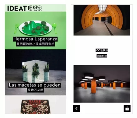IDEAT理想家App,繼承了法國IDEAT雜志的理念,以展示設計、藝術和風尚的「當代生活」內容為主。App界面上除了內容圖片之外,幾乎沒有黑白以外的其他色彩元素。通過襯以黑底的高亮白字,既是內容又是裝飾,貫穿在整個App設計元素當中;調節(jié)這些文字與其他內容之間的間距,又在排版上起到作為點,作為線,甚至作為面的不同功用。