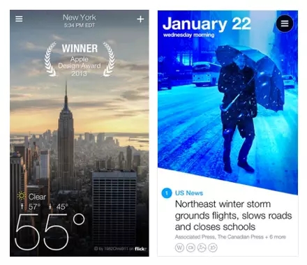 例如以設計精美著稱的Yahoo的兩款明星App產(chǎn)品Yahoo Weather!和Yahoo Digest。除了在產(chǎn)品設計上的和突出表現(xiàn)外,模糊和斜切的手法,給整個產(chǎn)品的品牌氣質提升到了一個新的高度。 Yahoo Weather! 不論是在布局、字體和色彩的運用上都顯得精致細膩,滑動時高斯模糊的處理更是流暢平滑。Yahoo Digest 的斜切突出一個“破”,在不影響照片內容的前提下,既能在視覺上顯得與眾不同,又在排版上巧妙地為色彩標簽留了一角之地。比起一刀平,更顯靈動而不失平衡感。