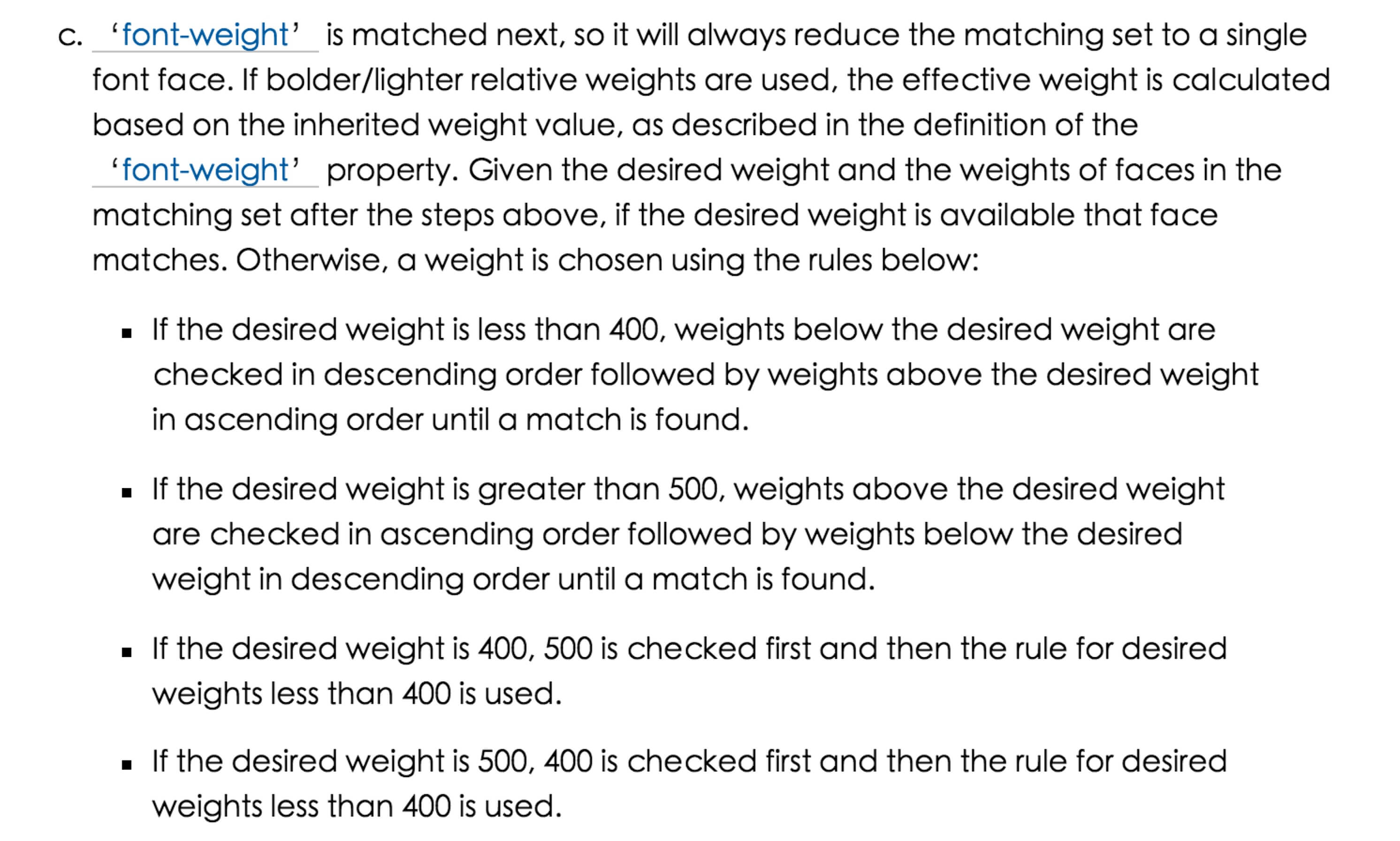 為什么呢?根據(jù)結(jié)果表現(xiàn),我們可以反推出,字重在瀏覽器去渲染時(shí)早已經(jīng)按照算法去一一匹配好。也就是,400匹配的字重在500匹配之前已經(jīng)匹配好了(說起來有點(diǎn)拗口,大家可以根據(jù)Figure.16的例子體會(huì)下)。