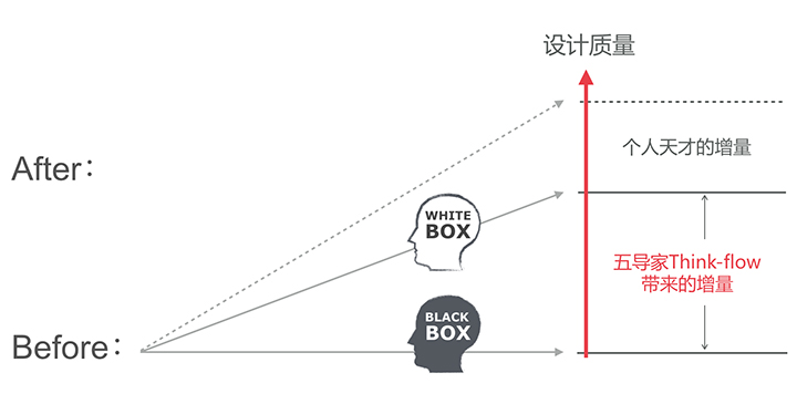 業(yè)務協(xié)同其實大家都不難理解,所有UED都在做這樣的事情,保質(zhì)保量的完成業(yè)務需求,不斷迭代產(chǎn)品進度;設計增值就有一些難度了,首先要搞清楚如何論證設計的價值,才能說出增值有多少,所以針對這個問題我們打造了頁面數(shù)據(jù)統(tǒng)計工具,方便設計師、開發(fā)、運營、PD低成本的查看頁面上線后的數(shù)據(jù)反饋,及時了解設計的結(jié)果。設計師要做到增值,我們會推行《五導家》,常規(guī)來說,設計師一般接到設計需求就進入設計執(zhí)行階段,中間思考過程是黑盒,即每次的設計都是發(fā)揮不同設計師個體價值,專業(yè)強的設計師輸出作品好一些,普通設計師輸出結(jié)果不穩(wěn)定,UED團隊整體輸出品質(zhì)不可預測,而《五導家》方法就是把設計過程的黑盒變成白盒的過程,是設計師常用方法抽象的5步過程,是設計工作的ThinkFlow。
