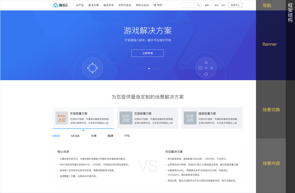 (如下圖所示為常見網頁形態(tài)結構,整個頁面UI開發(fā)同學需要得到的其實是設計師確認的框架結構,至于里面的圖標、banner配圖、抑或是文字內容都是可以后面提供的。具體來說,如下圖中,場景切換部分為三分陣列版式,灰色方框為圖標占位預留,UI開發(fā)同學只需要圖標占位尺寸即可,圖標細節(jié)和形態(tài),設計師在后面完成整體頁面框架后-上線前補齊即可。)
