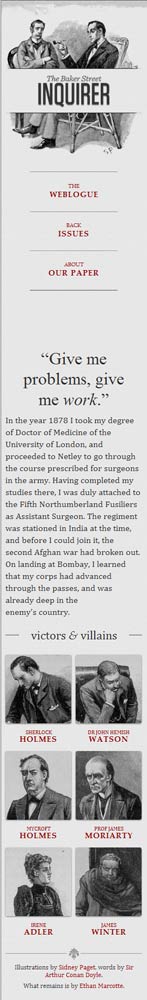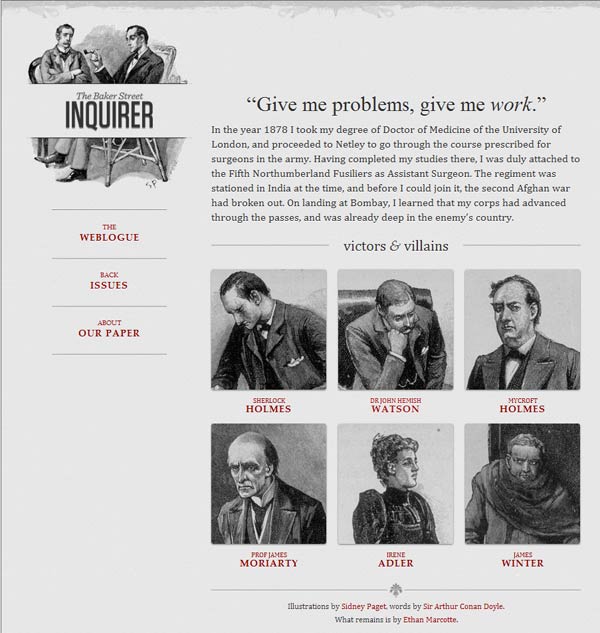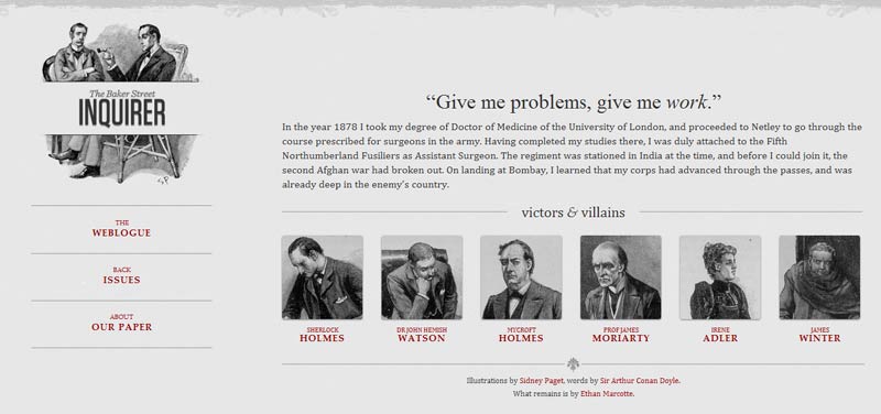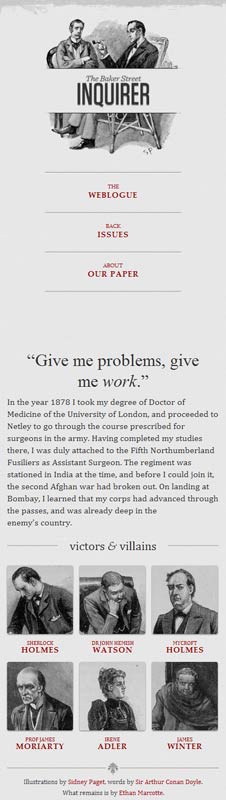 他制作了一個(gè)范例 ,里面是《福爾摩斯歷險(xiǎn)記》六個(gè)主人公的頭像。如果屏幕寬度大于1300像素,則6張圖片并排在一行。