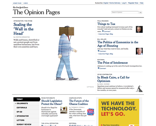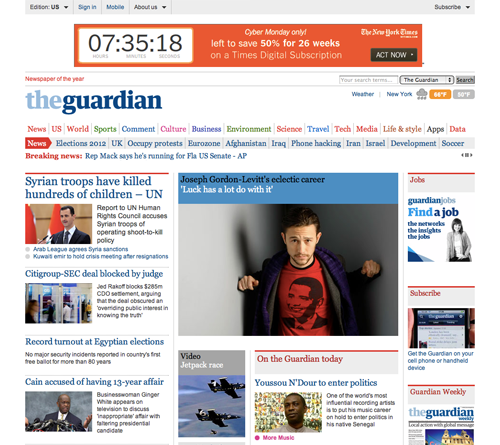 對于在線雜志或報(bào)紙一類需要呈現(xiàn)大量內(nèi)容的網(wǎng)站來說,要打造簡潔的頁面設(shè)計(jì)方案則更加困難。不過英國的衛(wèi)報(bào)(The Guardian) 以及一些同類型的在線報(bào)紙站點(diǎn)倒是向我們展示了通過固定寬度的網(wǎng)格布局實(shí)現(xiàn)簡潔設(shè)計(jì)方案的可行性: