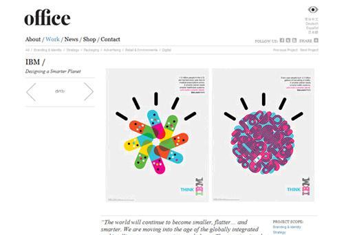 舉例來說,IBM的智能星球運(yùn)動 (Smarter Planet campaign)涉及到多個(gè)方面的主題,與其相關(guān)的印刷品、插畫、圖表、人機(jī)互動素材等都遵從著同一套方案標(biāo)準(zhǔn),包括幾何框架、線條風(fēng)格、色彩飽和度等。無論是在網(wǎng)站,還是在平面媒體中,相關(guān)主題的視覺表現(xiàn)形式都具有高度的一致性。