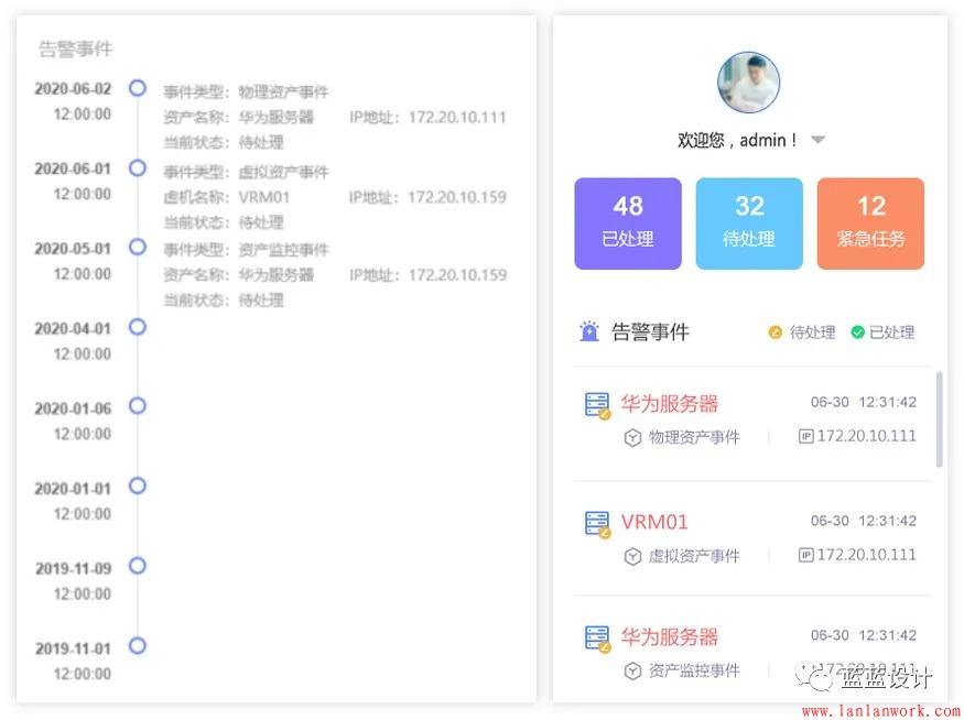 1. 理解用戶所需,優(yōu)化交互,增加部分內(nèi)容。告警事件除了原型中的時間線按順序發(fā)生外,加了用戶頭像,已處理、待處理、緊急任務統(tǒng)計數(shù)字,讓用戶可以總覽全局,做到對工作量心中有數(shù)。