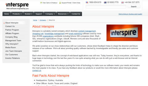 當(dāng)你在設(shè)計中克制而明智地使用色彩時,吸引訪客對重要項目的注意力就變得相當(dāng)容易。在 Interspire 的 “About Us(關(guān)于我們)” 頁面中,訪客的注意力被迅速吸引到頁面頂部LOGO那紅色的一點上,然后是標題,然后是頁面右邊的LOGO照片。