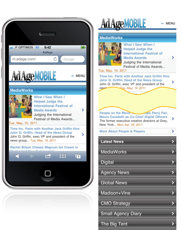 確實是這么回事。移動版本的站點,在布局方面,應該使主要內(nèi)容盡量多的占據(jù)著首屏當中的空間,而導航結(jié)構(gòu)則應該以某種縮略的形式出現(xiàn)在相對次要的位置。Wroblewski通過一個實例來倡導這個設計模式,也就是Ad Age的移動版站點 。其首屏當中,除了網(wǎng)站標題及內(nèi)容列表之外,右上角的菜單按鈕是界面當中唯一一個交互控制元素。當用戶點擊這個按鈕時,導航列表才會出現(xiàn)在屏幕當中??瓷先ィ麄€導航列表好像是另外一個界面,但它實際上是被放置在頁面最下方的,而菜單按鈕只是個錨點而已。