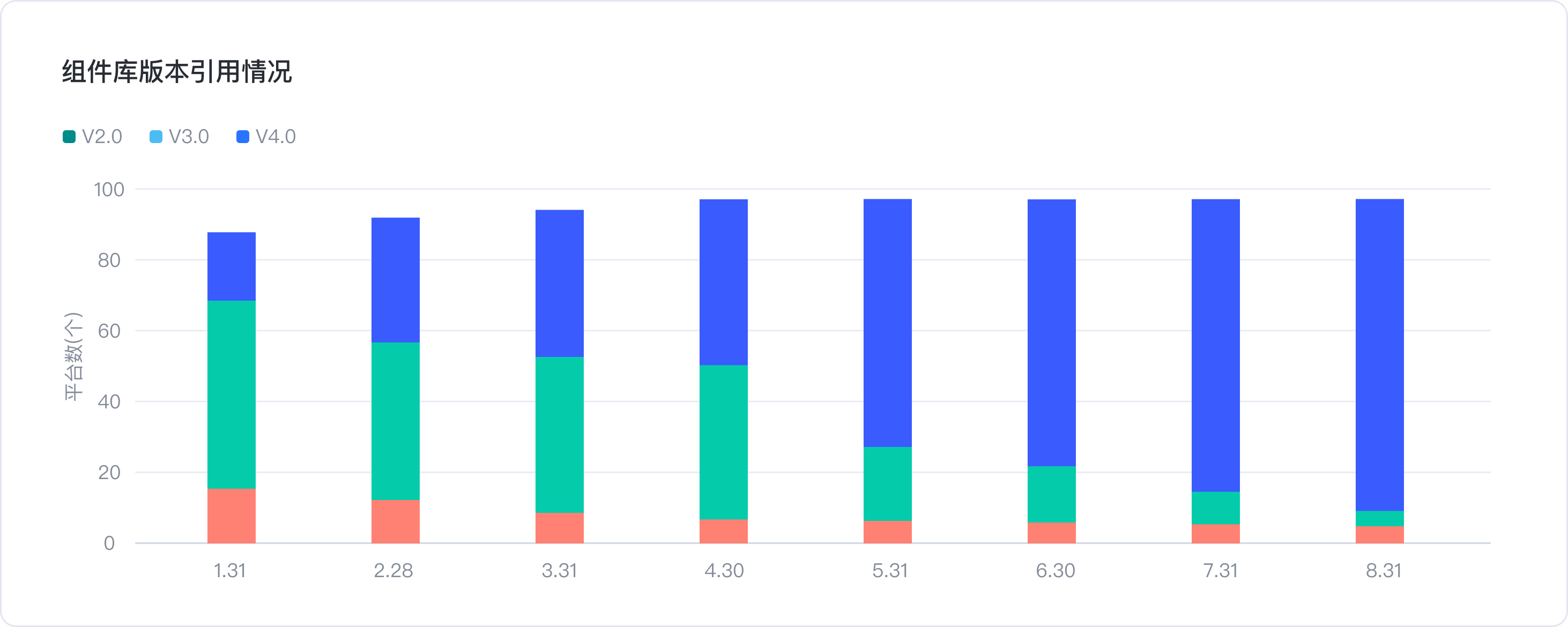 2.組件庫(kù)版本引用占比-各平臺(tái)引用的是哪個(gè)版本的組件庫(kù)(組件庫(kù)每升級(jí)一次,即為一個(gè)新版本)。