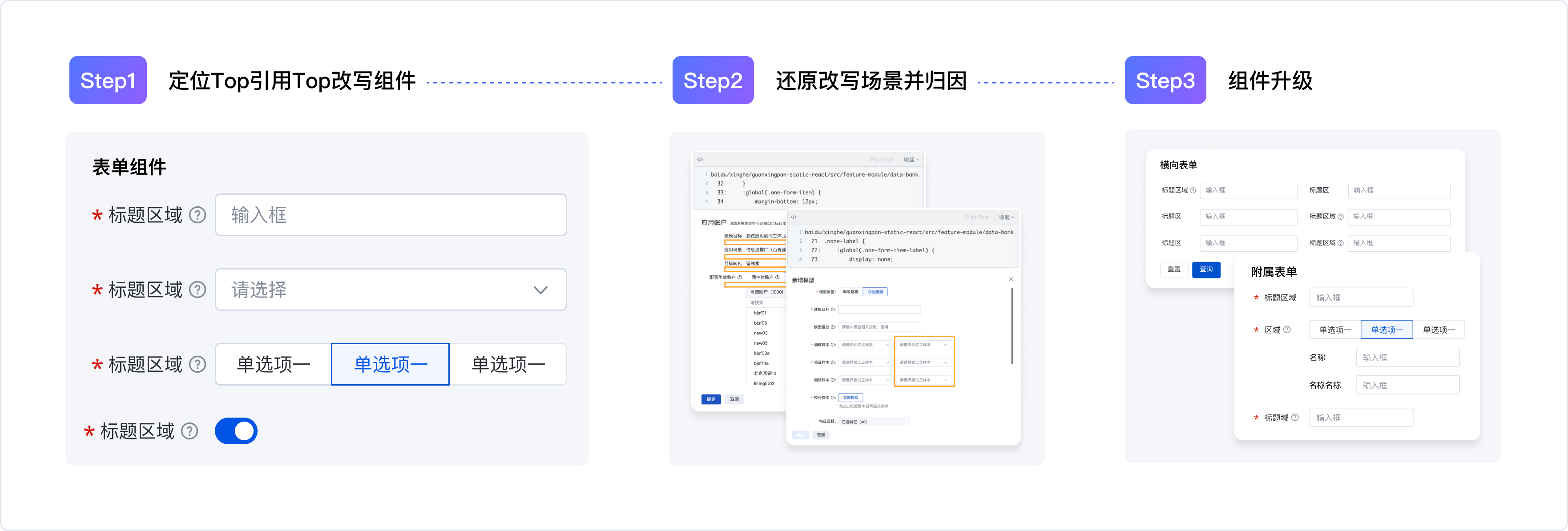 3.針對(duì)不同原因?qū)С鼋鉀Q手段進(jìn)行組件升級(jí):最后,根據(jù)上述問(wèn)題,逐一進(jìn)行設(shè)計(jì)和研發(fā)升級(jí)。升級(jí)后的表單組件再被業(yè)務(wù)方引用時(shí),免去了改寫(xiě)的成本,平均單次引用可節(jié)省約1h的研發(fā)耗時(shí)。