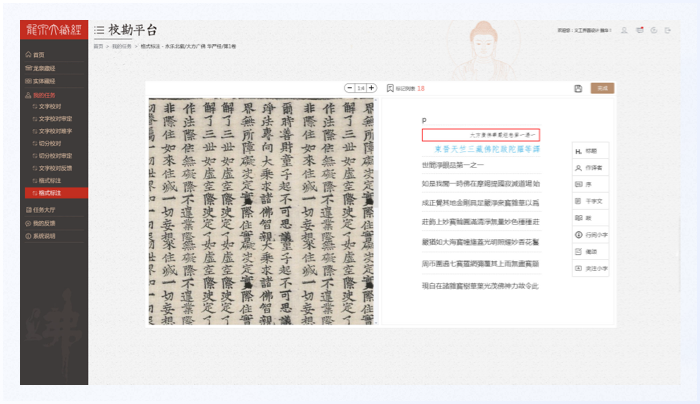 標(biāo)記文字通常用于解釋、說(shuō)明或強(qiáng)調(diào)藏經(jīng)中的某些部分,將其放在右側(cè)可以確保用戶(hù)在閱讀藏經(jīng)的同時(shí),能夠輕松地獲取到這些額外的信息。這種布局方式也有助于減少用戶(hù)的認(rèn)知負(fù)擔(dān),提高閱讀效率。