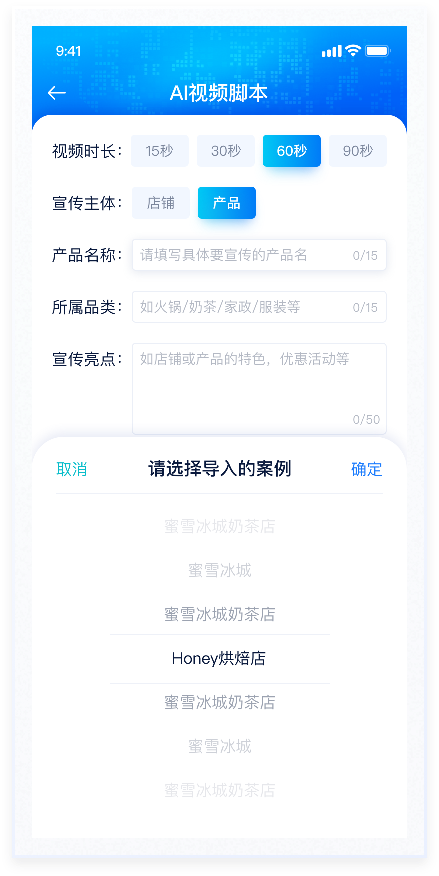 AI生成視頻腳本是用戶輸入相應(yīng)條件后,AI大模型通過系統(tǒng)算法生成視頻內(nèi)容。整體風(fēng)格較為科技感,因此在配色上使用藍(lán)色漸變及較重投影,符合產(chǎn)品屬性,能夠突出產(chǎn)品的創(chuàng)新性和先進(jìn)性。使用戶在使用過程中感受到強(qiáng)烈的視覺沖擊和沉浸感,這種體驗(yàn)有助于增強(qiáng)用戶對(duì)產(chǎn)品的興趣。