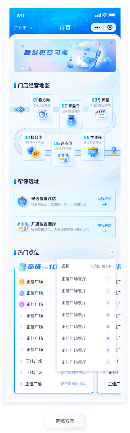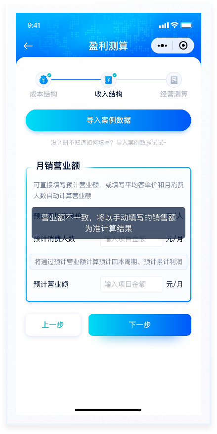 所盈利測(cè)算功能是產(chǎn)品的主要功能,通過AI對(duì)未來開店盈虧情況進(jìn)行預(yù)測(cè)評(píng)估。本次設(shè)計(jì)主要優(yōu)化該流程的交互及視覺表現(xiàn),整個(gè)流程分為“成本結(jié)構(gòu)”“收入結(jié)構(gòu)”“經(jīng)營測(cè)算”三個(gè)階段,過程填寫情況放置在頁面頂部,一步了然。已填寫使用主題色標(biāo)注,未填寫則使用置灰顏色處理,符合用戶基本感知。按鈕使用與主色相近的漸變色。