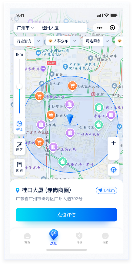 按鈕換膚在地圖上,“半徑”“選區(qū)”便于用戶對(duì)開店范圍的選擇,“圖例”則更側(cè)重圖標(biāo)說明性?!胺糯蟆薄翱s小”“定位”則是對(duì)顯示內(nèi)容的操作。