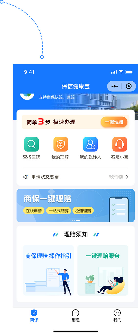 首頁界面將用戶最關(guān)心的部分展現(xiàn)出來,用戶可以通過點擊一鍵理賠極速辦理。其功能板塊包含了查找醫(yī)院、我的理賠、我的就診人、客服小寶三大功能。運營banner選擇插畫樣式,能夠緩解用戶的焦慮情緒,同時理賠須知采用小插畫加文字說明的形式,清晰且直觀。用戶可通過上滑查看界面內(nèi)容,優(yōu)化用戶交互體驗。